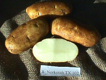 Russet Norkotah is a early-maturing potato released in 1987 by North Dakota State University(APJ 65:597-604, 1988). It is primarily a fresh market potato with good boiling and baking qualities. It is widely adapted to the western U.S. and performs especially well in the SLV. Selections were made at Texas A & M in the early 1990's. Five selections survived grower trials. The Texas selections were first selected in a field with very high early dying / verticilium pressure. Then they were further selected for heat resistence, vigor and tuber type. Texas line selections will have greater vine growth, yield and early dying tolerance with excellent tuber appearance and percentage of U.S. #1's.